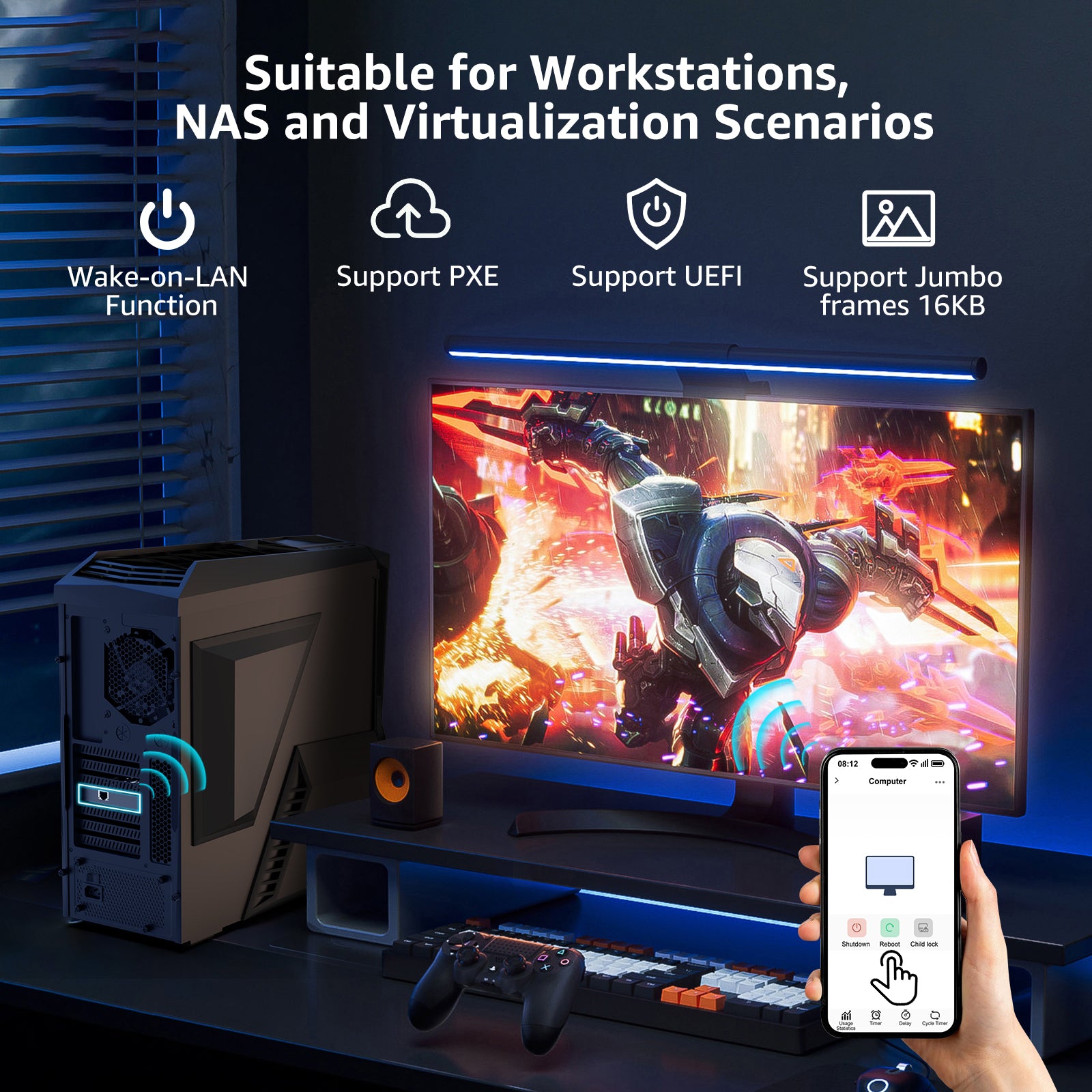 - Wake-on-LAN Function: This 10G PCIe ethernet card adapter supports various data rates, including 10Gbps/5Gbps/2.5Gbps/1Gbps/100Mbps Ethernet connections. The Wake-on-LAN feature ensures plug-and-play functionality for network adapters, offering convenience and efficiency.