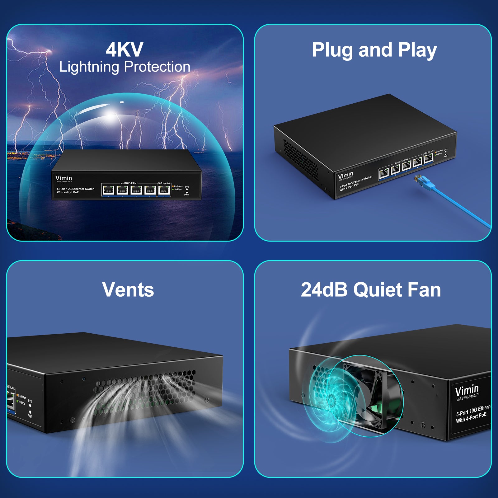 - ✓ SUPPORT IEEE 802.3af/at: This 4-port 10G PoE switch supports IEEE 802.3af/at standards, offering compatibility with various devices. With up to 30W per port and a total power budget of 150W, it provides reliable power for multiple high-power devices.
