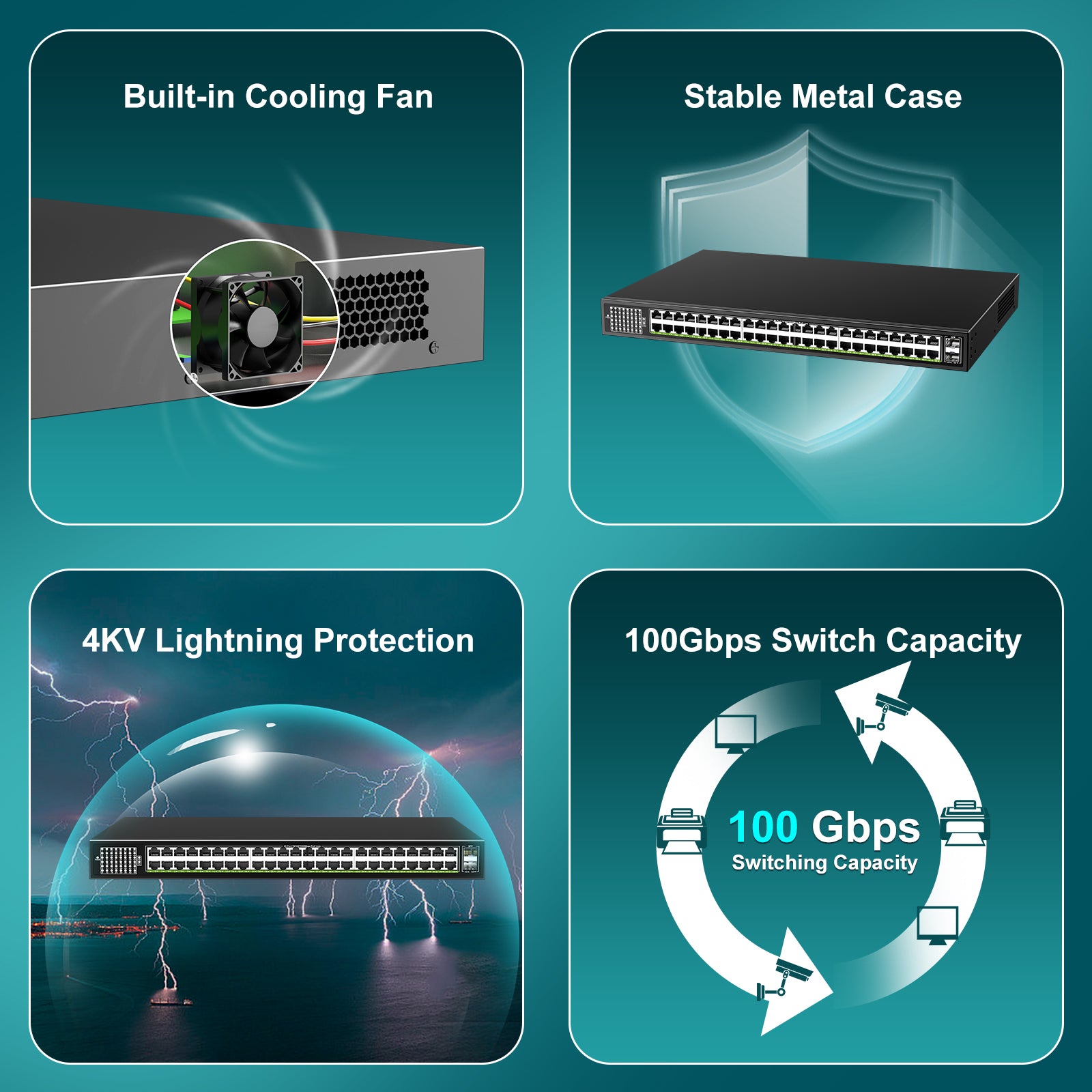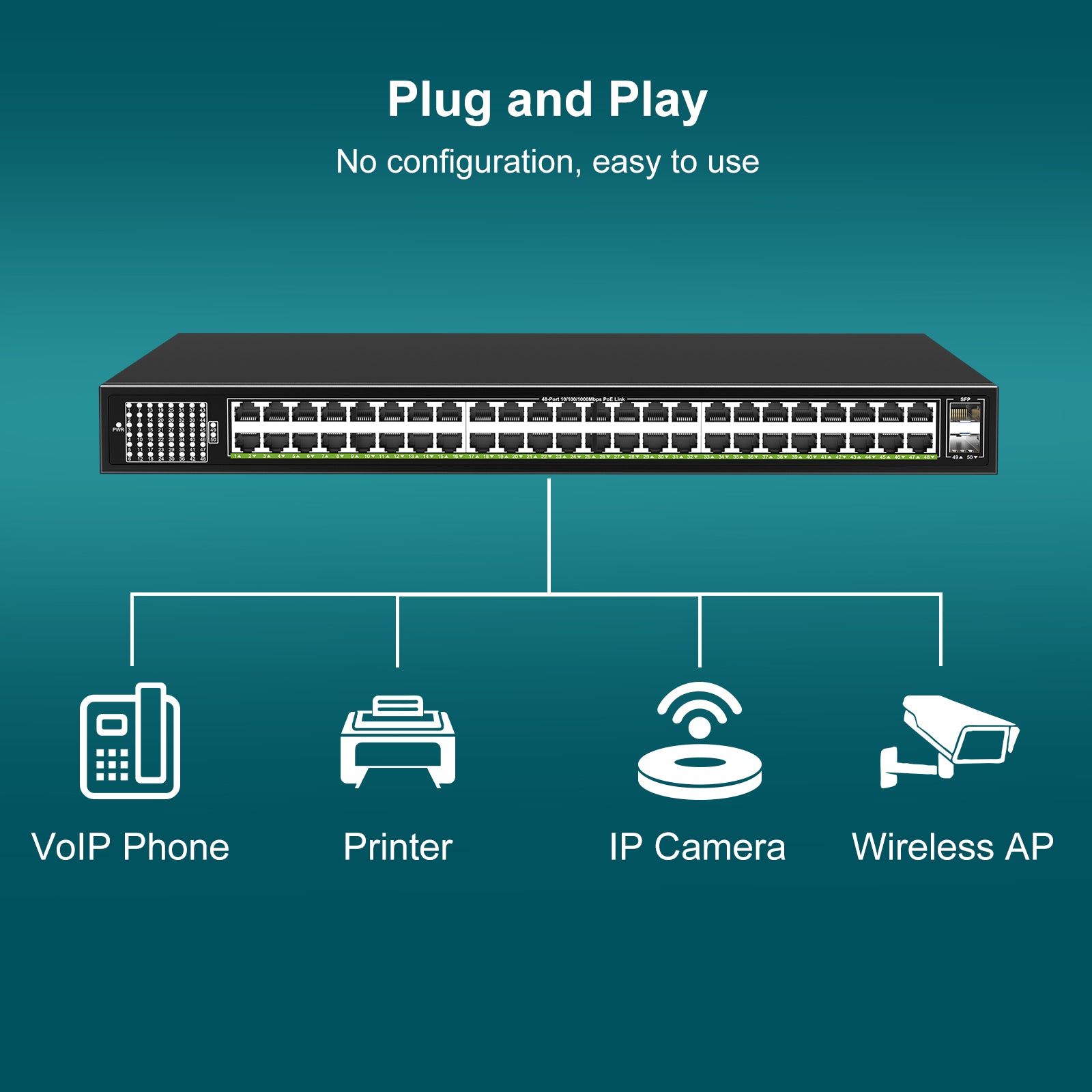 - 48x Gigabit Ports & 2x Uplink SFP Ports: This 50-port Gigabit PoE+ switch features 48 PoE+ RJ45 ports, 2 Gigabit uplink SFP ports for connecting to routers, NVRs, wireless AP, IP phone, and more. With high-speed data transmission and power delivery over the network cable, it offers a reliable solution for your devices.