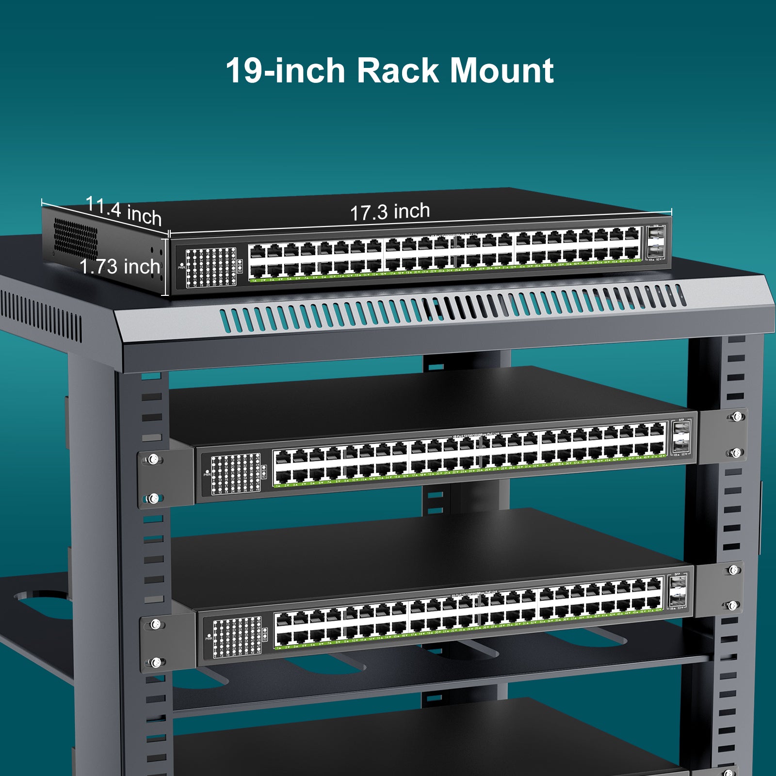 - Versatile Installation: With its sturdy metal casing, this 48-port power over ethernet gigabit switch can be easily placed on a desk, or installed in a rack, making it a versatile networking solution for various environments.
